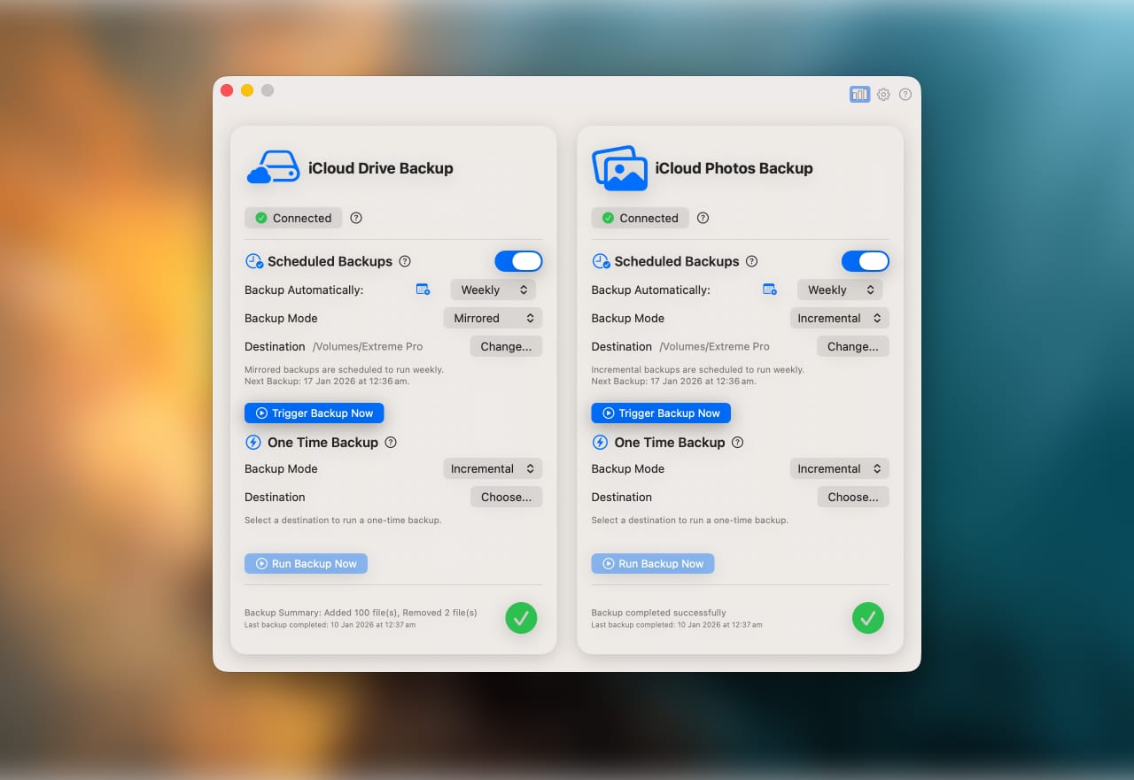 What I appreciate most is how it handles changes. Delete a file from iCloud Drive? It disappears from the backup on the next run. Update a document? The new version syncs over. Because I'm using the "Mirrored" mode, my backup stays an exact reflection of my cloud storage (no bloated archives, no duplicate versions eating up space). There are also "Full" and "Incremental" modes if you prefer keeping historical copies.